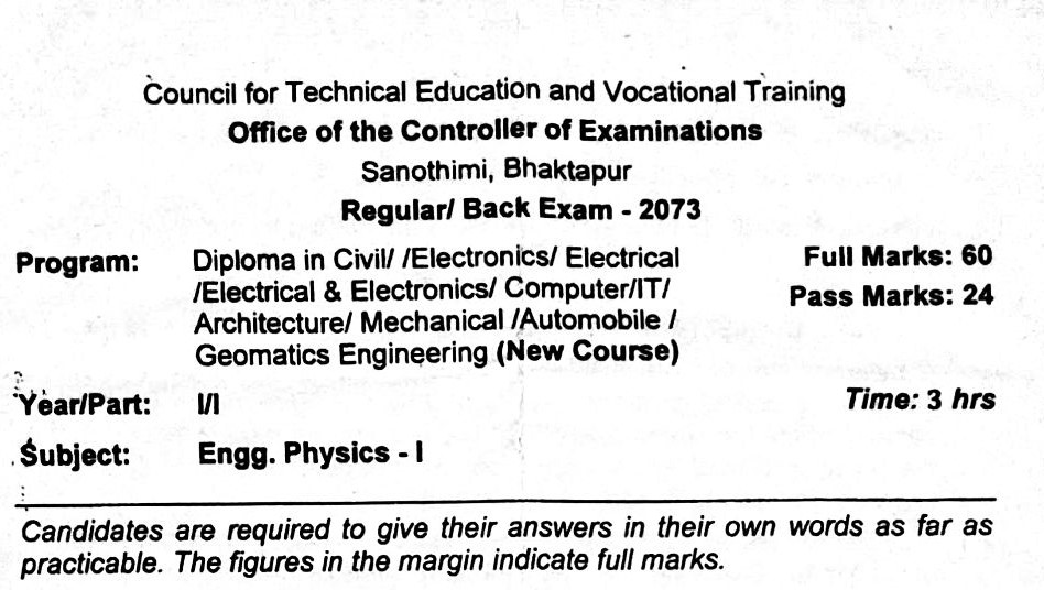 Here you'll provided you the question papers of Physic of 1th semester - Diploma in Computer engineering - CTEVT